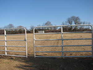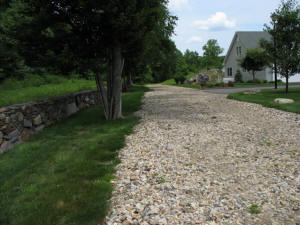 The unpaved portion of Old Coram Road exits the woods near the entrance