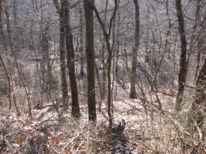 The eastern half of the Tall Farm property is wooded and drops rapidly in places. Eventually it levels off for a bit, creating a 'bench' in the river bluff that was once used for the main road along the river, now called "Old Coram Road". The historic old roadbed still exists as a walking path.