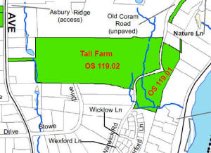 There are currently no officially blazed hiking trails on the properties, but locals do walk the property. There is public parking in a small lot created for that purpose just outside the Waterview Landing development at the end of Warwick Road. Follow the gravel fire lane into the woods, where it turns into Old Coram Road (closed to traffic). Note that the properties north of Tall Farm along Old Coram Road are wooded and may appear to be open space but are actually private. There are chronic problems with ATVs and parties, much of that occurring on the private properties. One can walk to the end of the old roadbed then follow the paved portion of Old Coram Road to Moulthrop Lane and the scenic Southbank Park on the river below.