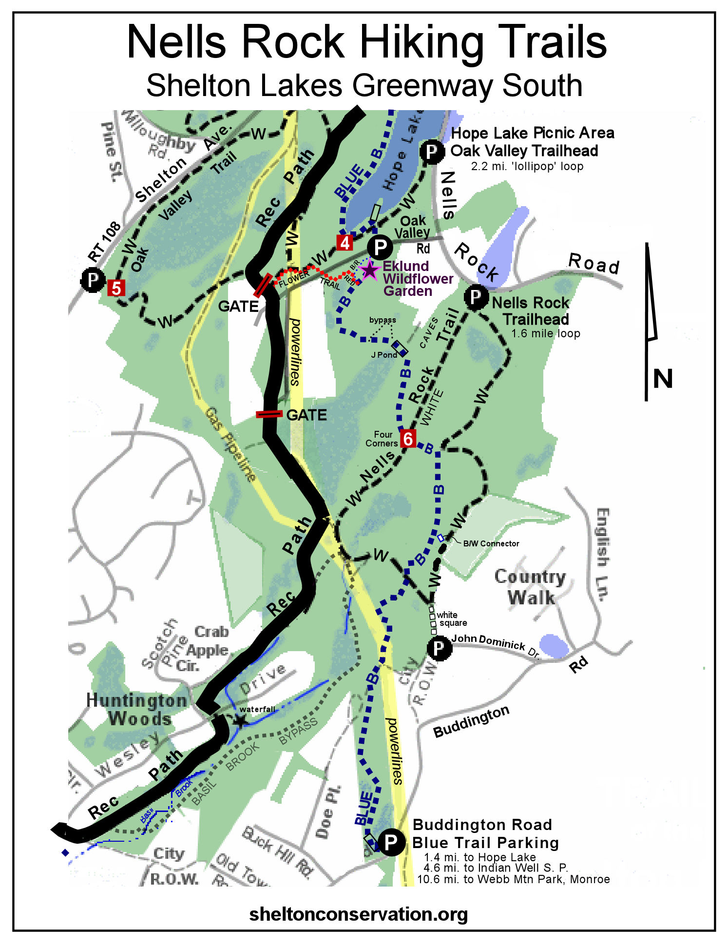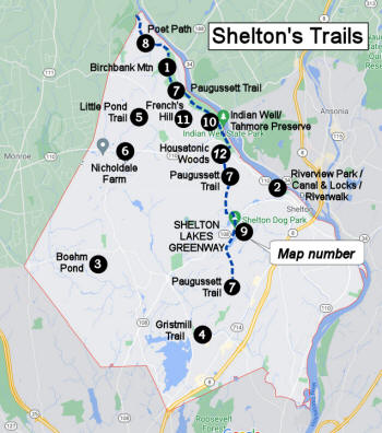 There are about 32 miles of marked hiking trails in Shelton, from the handicapped-accessible Shelton Lakes Recreation Path to the challenging Paugussett "Blue Dot" Trail. Before you head out on a trail, be sure you have a map, know how to read trail blazes, and are familiar with trail etiquette (see margin at right).