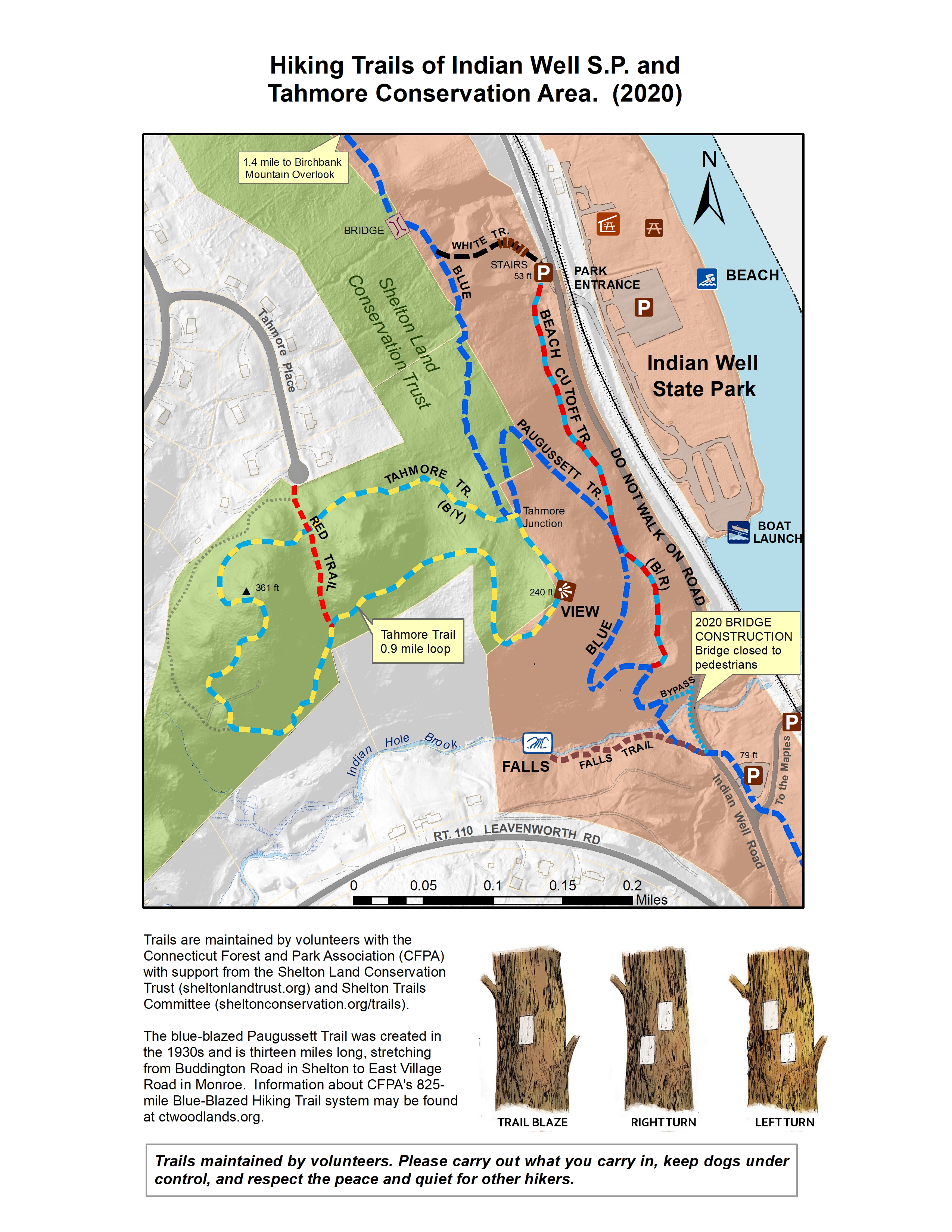Online map: Please allow a full minute for this Google Paugussett Overview Map to load. Once it's loaded, you can use it to obtain driving directions or use with a smart phone for turn by turn directions. You can also turn on contours or the satellite view. The trail route shown is approximate only, and we recommend that hikers purchase a copy of the CT Walk Book (West Edition), which contains hiking maps and descriptions of the older part of the trail from Indian Well to Monroe, as well as many other Blue-Blazed trails in Connecticut. Your purchase also supports CFPA, the nonprofit organization that maintains all the Blue-Blazed Trails in Connecticut.