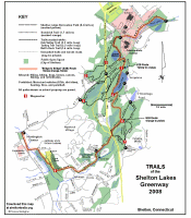 Paugussett Restoration: In the early 1990s, the Conservation Commission and Open Space Committee began planning for the restoration of the Paugussett Trail south to the town line. A corridor of land was gradually acquired, allowing for the trail to be routed completely on public land. The Shelton Trails Committee constructed the new trail route from Indian Well State Park to Buddington Road in the Shelton Lakes Greenway, which the exception of a section at Mayflower Lane, which is bypassed by walking on the pavement for 1000 feet. The Trails Committee will continue to extend the trail to the Stratford town line if possible.